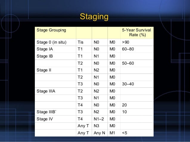 Survival rates can give you an idea of what percentage of people with the same type and stage of cancer are still alive a certain amount of time usually 5 years after they were diagnosed. The 2 most important stage indicators are the tumour and the lymph nodes. Survival for women is slightly lower at one year but similar at five years with 38.