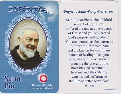 Laminated Healing Saint Holy Prayer Card With 3rd Class Relic 3 3 8 Inch Saint Padre Pio Patron Of Those With Pain And Those In Need Of Healing